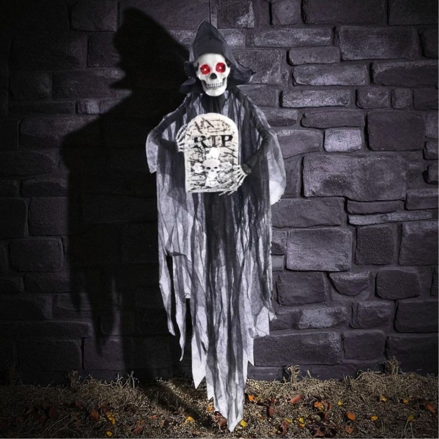 O funcionamento é simples: o boneco requer 3 pilhas AA (não inclusas) para ativar luz e som. Sua estrutura combina materiais resistentes e acabamento detalhado, trazendo uma lápide decorativa acoplada ao personagem esquelético. Ideal para montar cenários arrepiantes e realistas em casas, vitrines, lojas ou salões de festa.