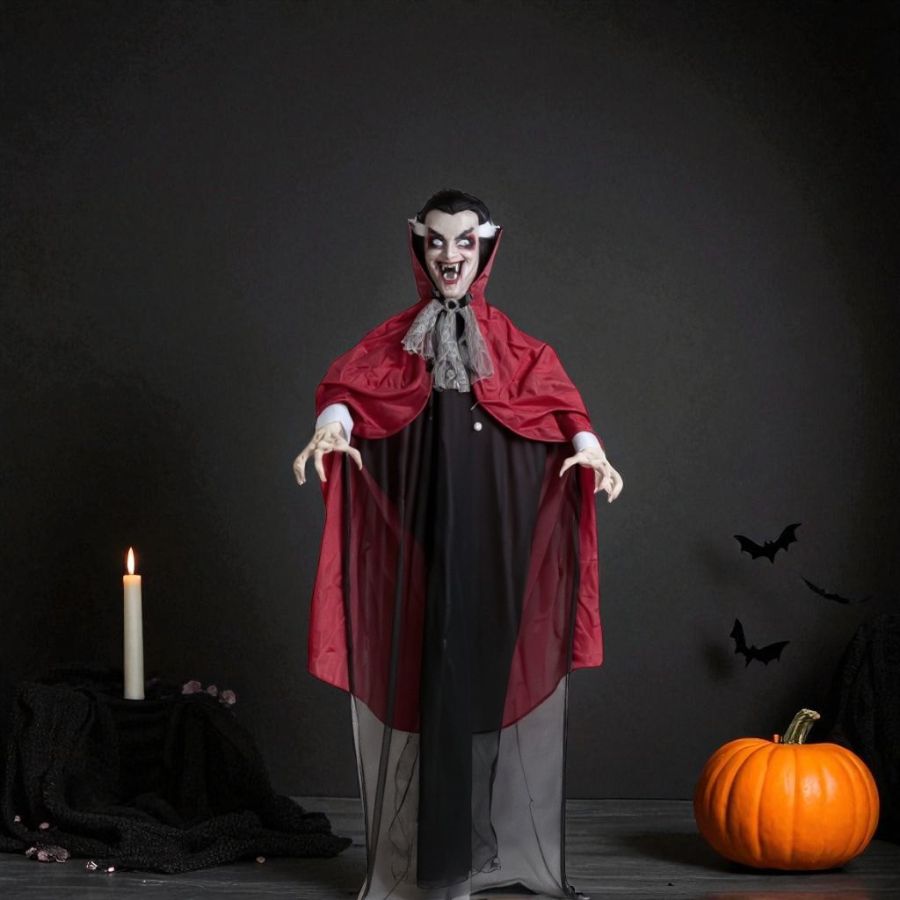 Enfeite decorativo Halloween vampiro Pretus 1,80m com som e movimento, perfeito para festas, eventos, cenários temáticos e decorações assustadoras.