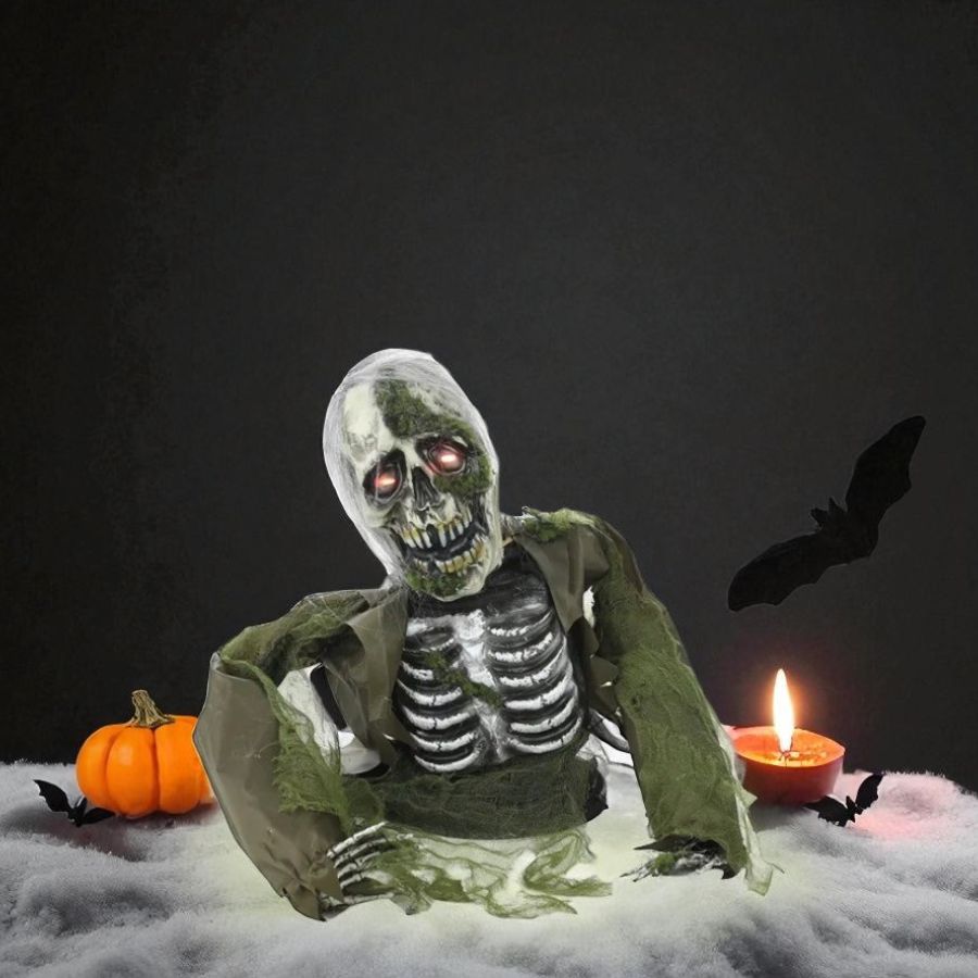 Enfeite decorativo Halloween zumbi Cedrik 37,5x24,5cm com som e movimento, perfeito para festas, eventos, cenários temáticos e decorações assustadoras.