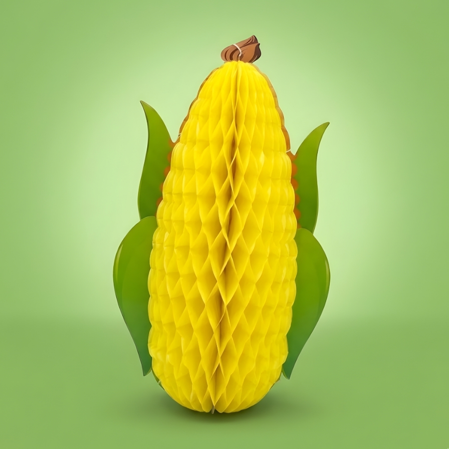 Enfeite confeccionado em papel seda, no formato de milho decorativo. Possui dimensões aproximadas de 32cm de altura e 18,5cm de largura. Indicado exclusivamente para uso decorativo. Por ser um material leve e delicado, recomenda-se manuseio cuidadoso e evitar contato com umidade ou água. Não indicado para uso externo em condições climáticas adversas.