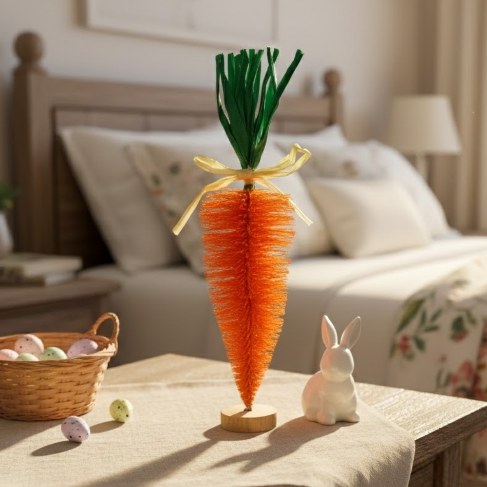 Use em mesas de Páscoa, arranjos com galhos, cestas decorativas ou junto a outros elementos temáticos como coelhos, ovos e flores artificiais. Combine com tons neutros ou pastel para valorizar o brilho da cenoura.