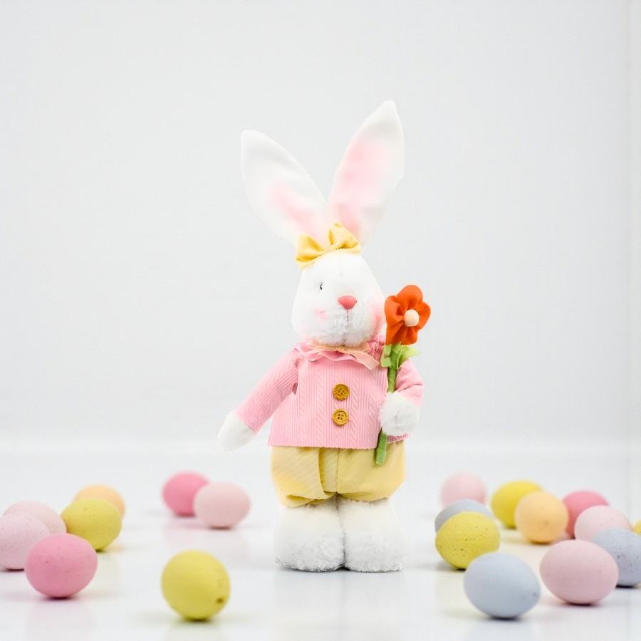 O enfeite mede 43x14x8cm e representa uma coelha em pé segurando uma flor, confeccionada com materiais de qualidade e excelente acabamento. Ideal para decorações de Páscoa com toque rústico e sofisticado, proporcionando um ambiente acolhedor e cheio de encanto.