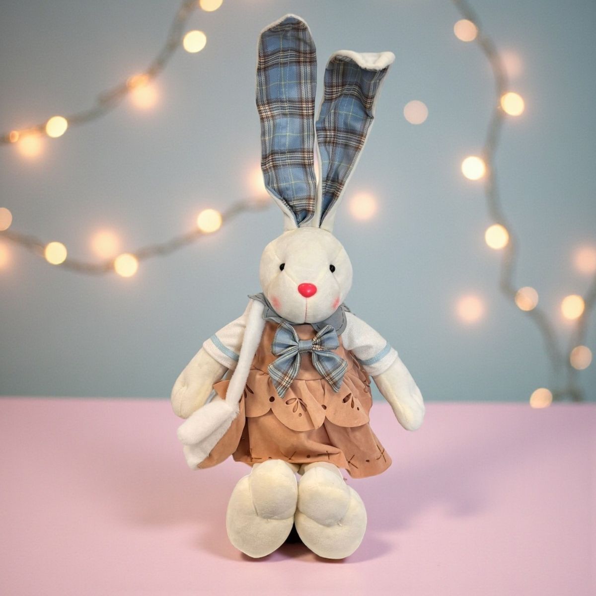O Enfeite Decorativo de Páscoa - Coelho de Vestido e Bolsa - 54cm é uma peça encantadora que traz um toque de ternura e sofisticação à decoração pascal. O coelhinho, todo branco e com detalhes em xadrez azul, veste um delicado vestido bege e um laço no pescoço, transmitindo elegância e charme. Ele carrega uma bolsa em formato de cabecinha de coelho, um detalhe gracioso que torna o enfeite ainda mais especial e temático.