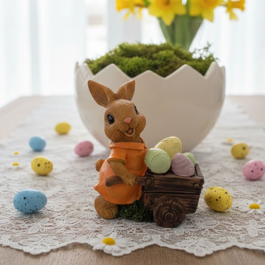 Divertido, delicado e cheio de encanto, o Enfeite Decorativo de Páscoa Coelhinho com Carriola de Ovinhos traz uma cena lúdica que traduz toda a magia da Páscoa. O coelhinho empurrando sua carriola repleta de ovinhos desperta alegria e ternura, criando uma decoração leve e acolhedora que celebra a data com imaginação e afeto.