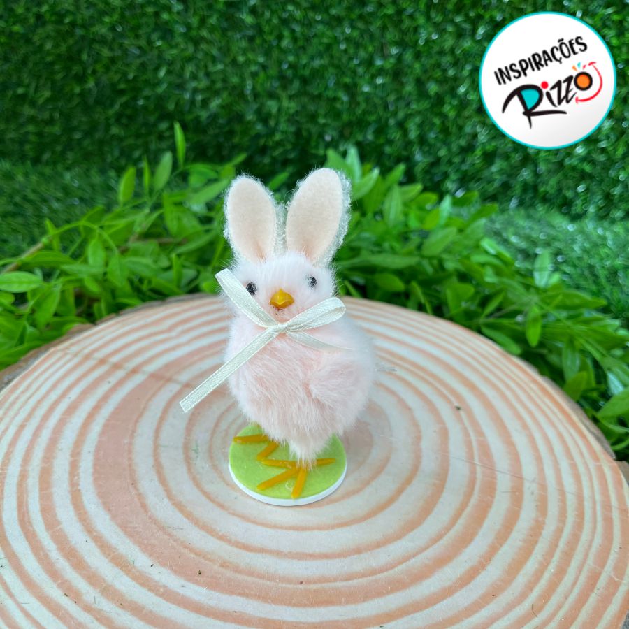 Enfeite decorativo de Páscoa com pintinho usando orelha de coelho, olhando para a esquerda, medindo 10 cm. Ideal para compor uma decoração temática e encantadora.