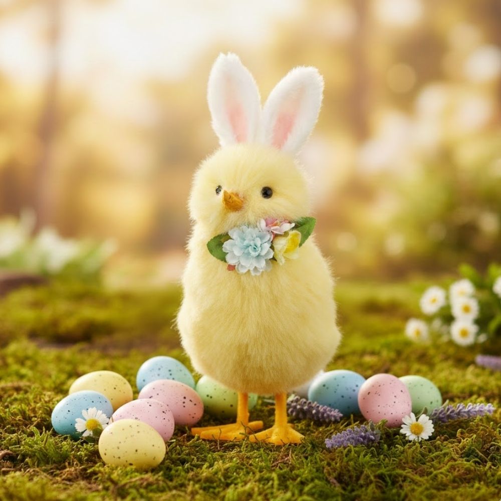 Utilize o pintinho decorativo de Páscoa como destaque em composições temáticas ou combine com coelhos, ovos decorativos e flores para criar um cenário ainda mais acolhedor e alegre.