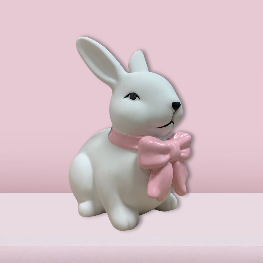 Enfeite decorativo de Páscoa em dolomita com coelho fosco sentado e laço, medindo aproximadamente 13x9x17cm, ideal para decorar mesas, vitrines e ambientes temáticos de Páscoa.