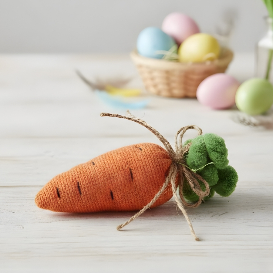 O enfeite decorativo de tecido no formato de cenoura possui dimensões aproximadas de 13x5x4cm e acabamento nas cores laranja e verde. É indicado para uso em decorações temáticas, especialmente de Páscoa, além de ambientes internos, vitrines e composições decorativas variadas.