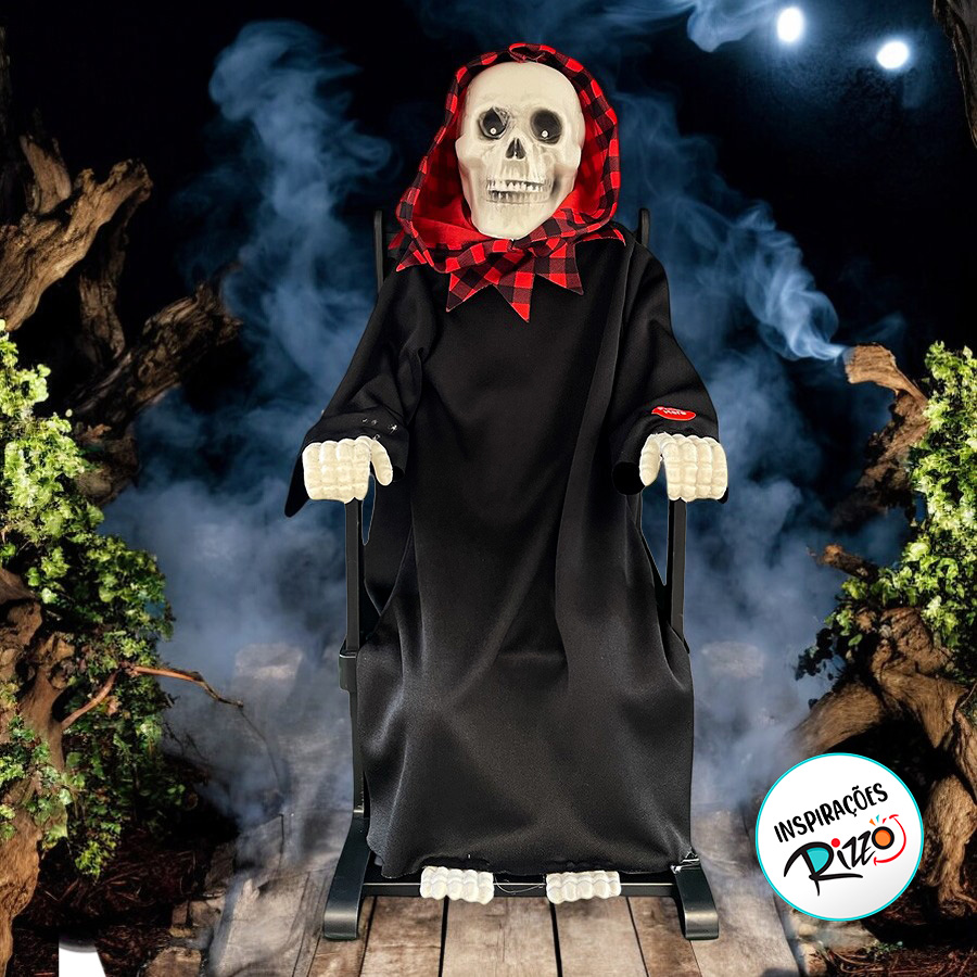 Caveira de Halloween vestida de preto com touca em xadrez vermelho, sentada numa cadeira de balanço. A Caveira faz movimento e tem som, além de seus olhos brilharem com luz.