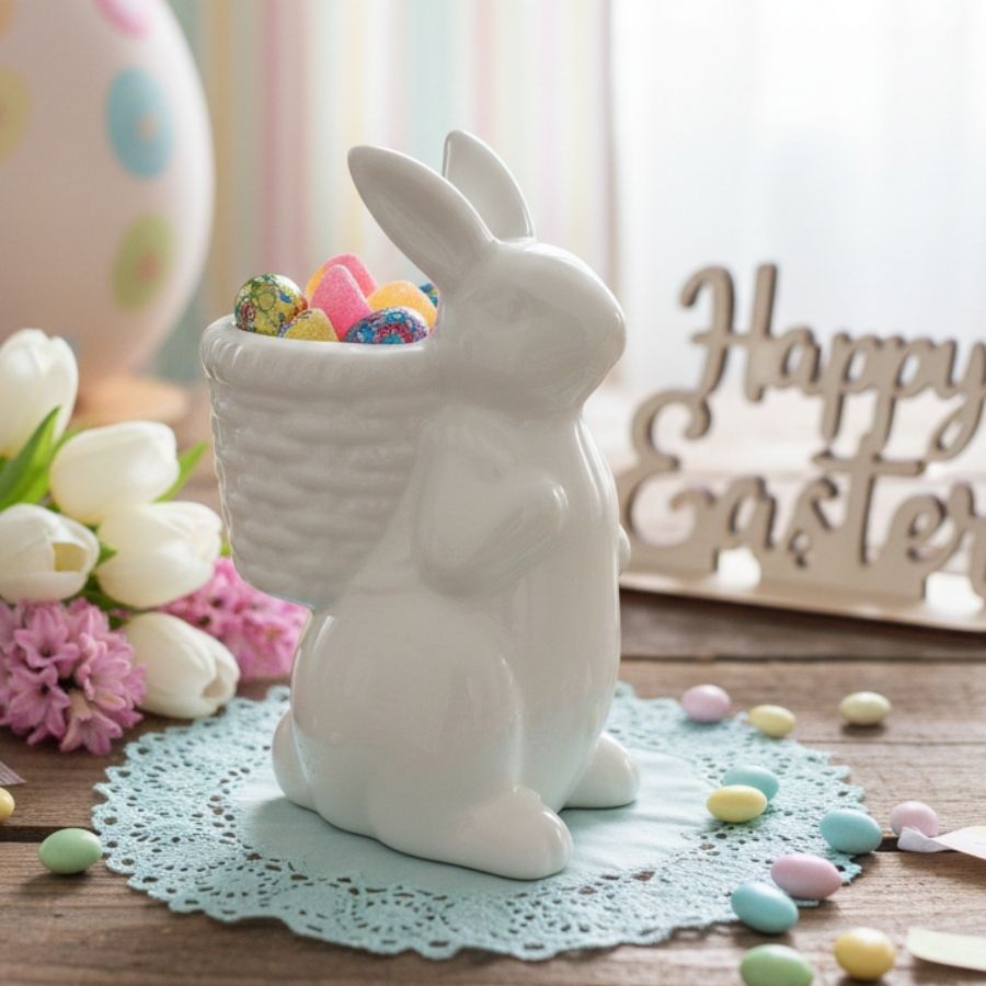 Enfeite decorativo de Páscoa em cerâmica no formato de coelho branco com cesta nas costas, ideal para mesas, vitrines e cenários temáticos. Mede aproximadamente 13,8x6,2x9cm e adiciona elegância e simbolismo à decoração pascal.