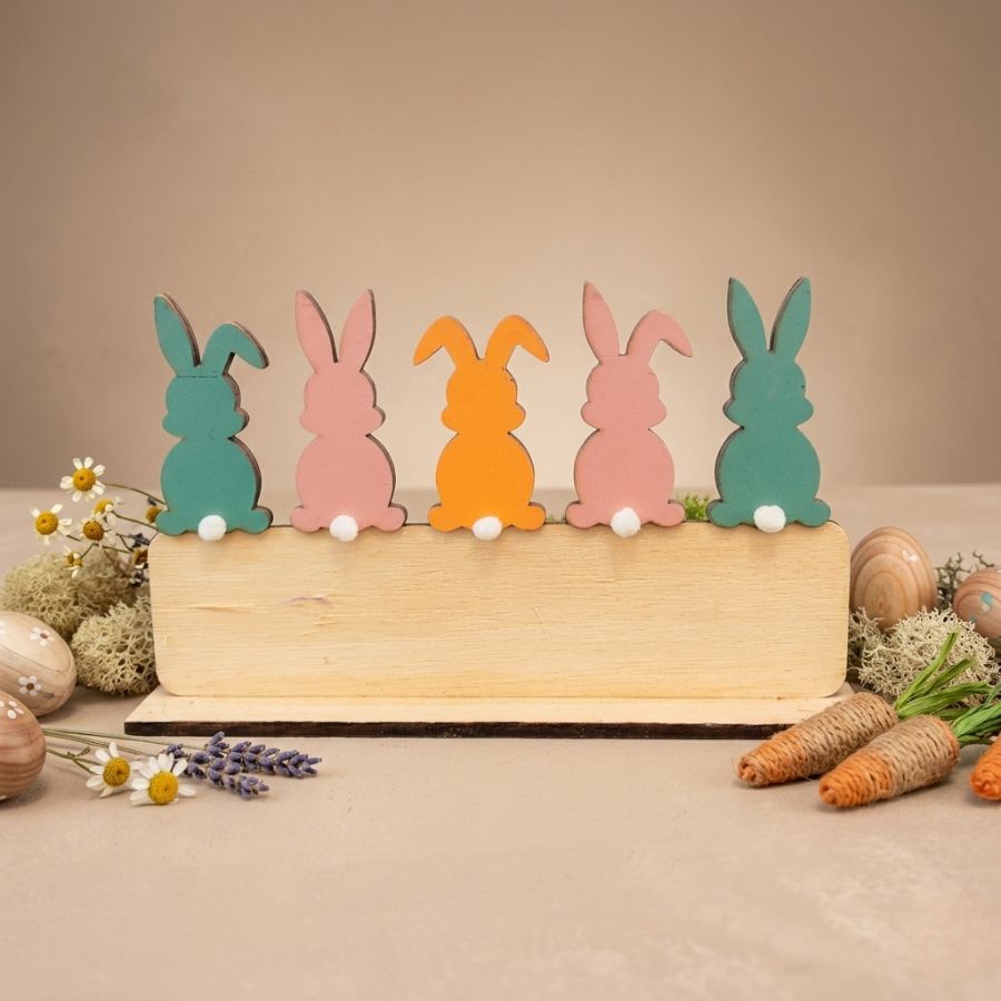 Enfeite em MDF para páscoa com 5 coelhos nas cores verde, rosa e laranja com pompom branco