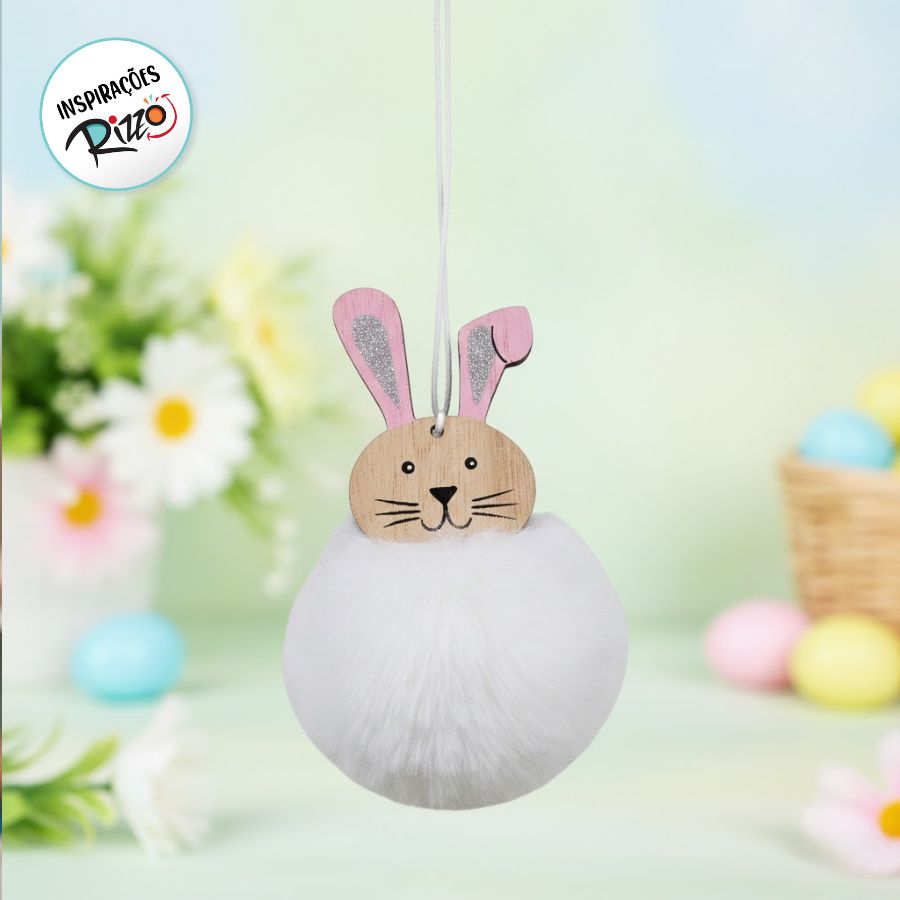 Enfeite de Coelho para pendurar, em uma bolinha branca felpuda