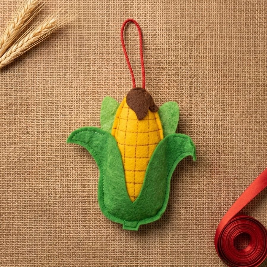 Enfeite de feltro em formato de milho, tamanho 16x15 cm, ideal para pendurar e decorar festas juninas com charme e estilo artesanal.