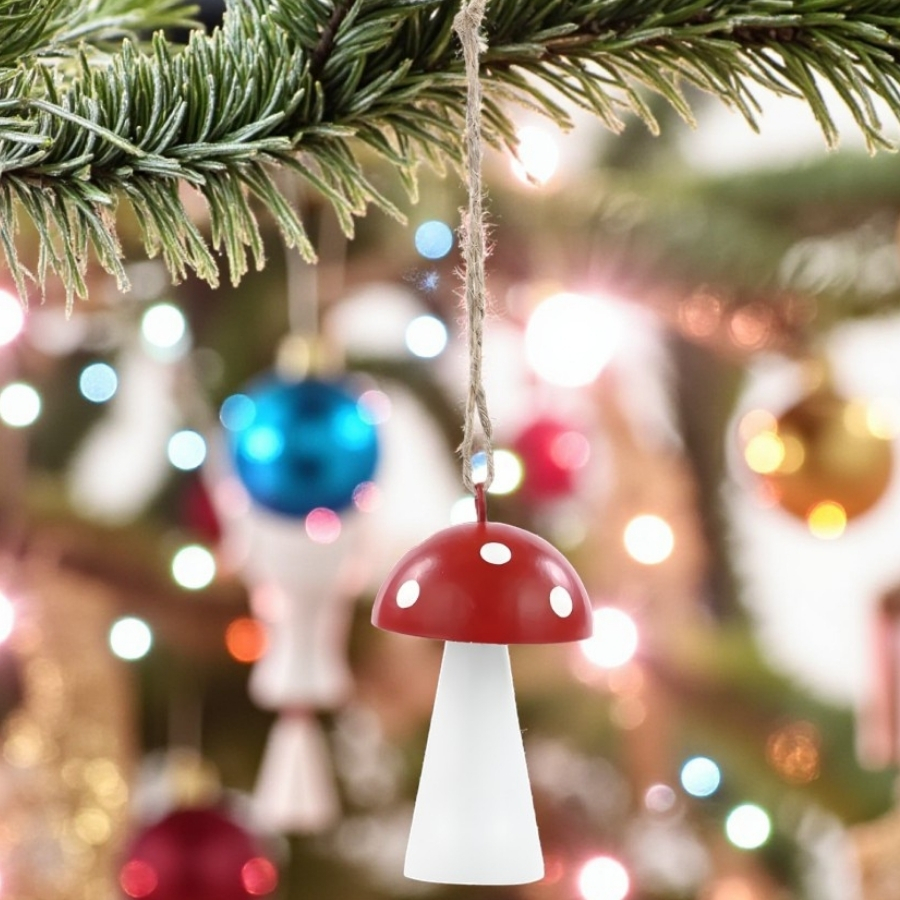 Enfeite decorativo de Natal em formato de cogumelo, cor vermelha, para pendurar. Medidas: 8x4,5x2,5cm. Ideal para árvores de Natal, guirlandas e decoração temática, proporcionando destaque e estilo à celebração.