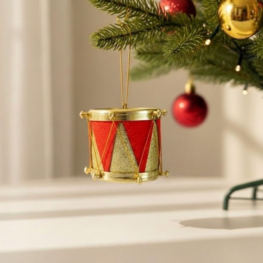 Enfeite decorativo de natal para pendurar, tambor vermelho e dourado com estampa