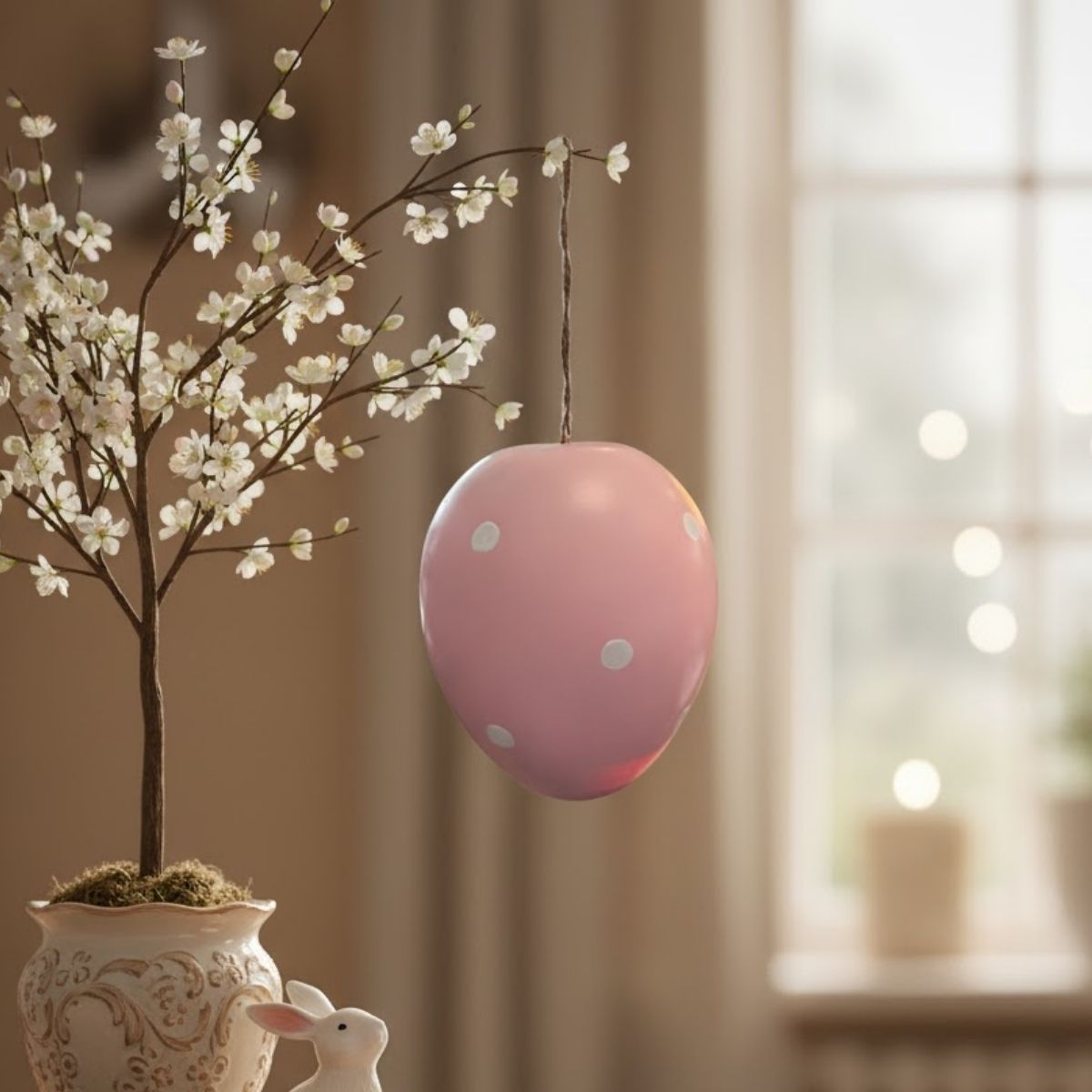 O Enfeite Para Pendurar de Páscoa – Ovo Rosa com Bolinhas – 15cm é uma opção delicada e encantadora para deixar sua decoração ainda mais especial. Ele possui formato de ovo com um lindo tom rosa pastel, decorado com bolinhas brancas que garantem um visual suave, alegre e perfeito para composições temáticas. Com 15cm, é ideal para árvores de Páscoa, guirlandas, portas, janelas, arranjos ou até como detalhe em embalagens de presentes.