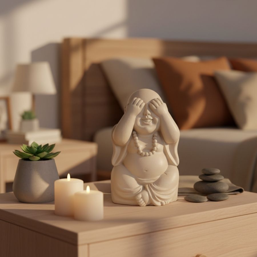 Produzida em cimento durável, a peça apresenta acabamento rústico em tonalidade bege clara, conferindo solidez e um visual natural. Com medidas aproximadas de 11,5x6cm, o design detalhado retrata o Buda sentado com as pernas cruzadas, mãos cobrindo os olhos, colar de contas e expressão serena, integrando perfeitamente salas, quartos, escritórios ou espaços zen. Pode ser usada sozinha ou em conjunto com os outros Budas Sábios, sendo também uma excelente opção para presentear quem valoriza detalhes decorativos com significado e sofisticação.