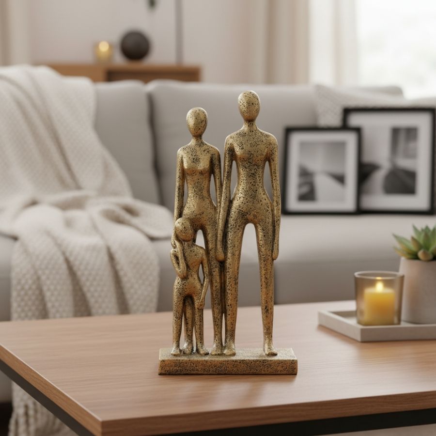 Escultura em poliresina dourada representando uma família de três figuras estilizadas, ideal para decorar ambientes com estilo, detalhes afetivos e sofisticação no Home Decor.