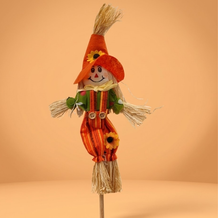 Enfeite decorativo em formato de espantalho com haste (palito) e chapéu na cor laranja. Possui dimensões aproximadas de 14cm de largura e 46cm de altura. Indicado para uso decorativo em vasos, arranjos e composições temáticas. Recomenda-se evitar contato com umidade ou líquidos para preservar a integridade do produto.