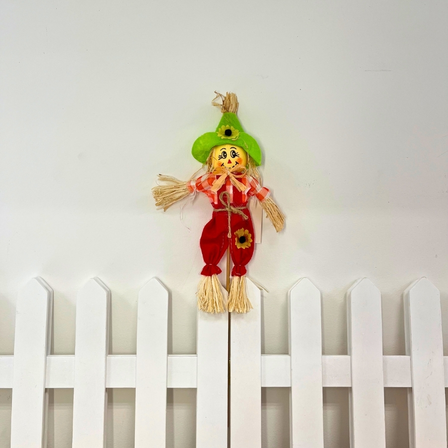 Espeto decorativo com boneco de espantalho feito artesanalmente, ideal para jardins ou ambientes externos temáticos. Confeccionado em isopor, tecido, palha e madeira. Medidas aproximadas: Altura 40cm x Largura 21 cm. Contém 1 unidade.