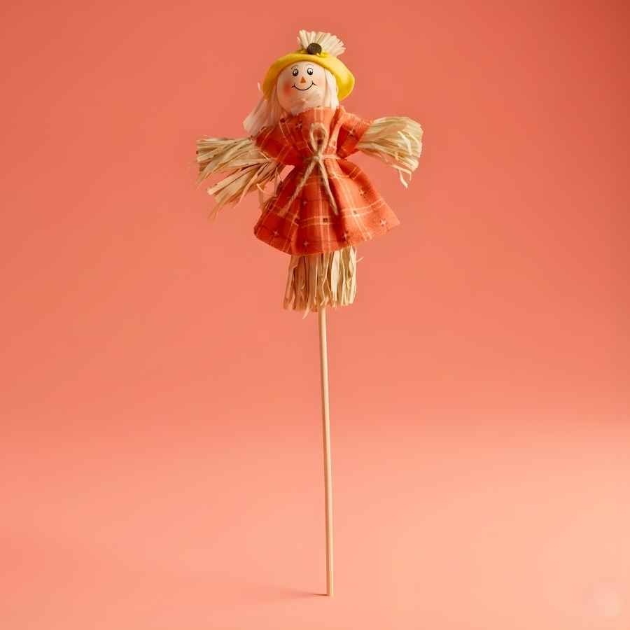 Pick decorativo em formato de espantalho com vestido vermelho. Possui dimensões aproximadas de 12cm de largura e 31cm de altura. Indicado para uso decorativo em arranjos, vasos e composições temáticas. Recomenda-se evitar contato com umidade ou líquidos para preservar a integridade do produto. Caso utilizado em alimentos, recomenda-se o uso de proteção na parte que entra em contato.