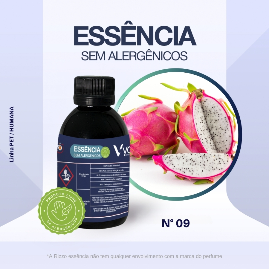 Essência Pitaya Concentrada para Perfumaria e Animais N°09 - 100g - Allergen Free é uma fragrância frutada, refrescante e exótica, desenvolvida especialmente para oferecer um toque tropical e agradável aos produtos de cuidado pessoal e ao ambiente dos pets. Com alta concentração e formulação Allergen Free, ela é segura para o uso em cosméticos artesanais, como shampoos, loções, sabonetes, além de ser ideal para produtos voltados ao bem-estar animal, como perfumes e sprays de ambiente. A embalagem de 100g garante excelente rendimento, mesmo em produções maiores.
