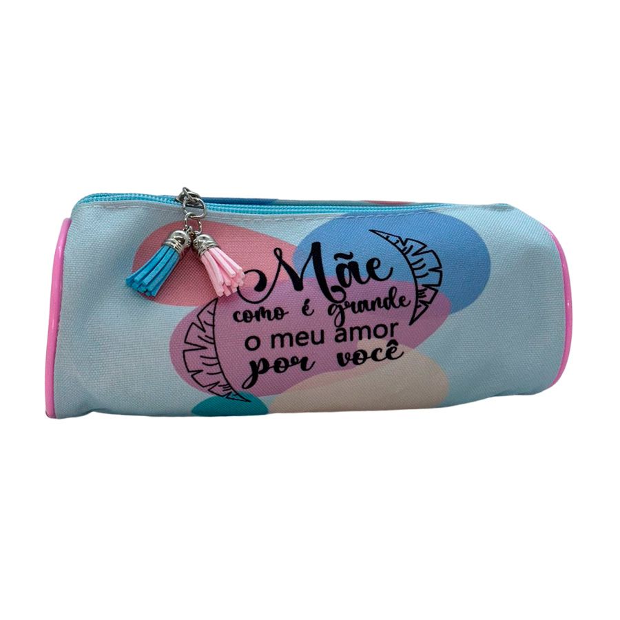 Estojo Redondo com fundo de cor azul claro, ziper azul e a mensagem "Mãe Como é Grande o meu Amor por Você"