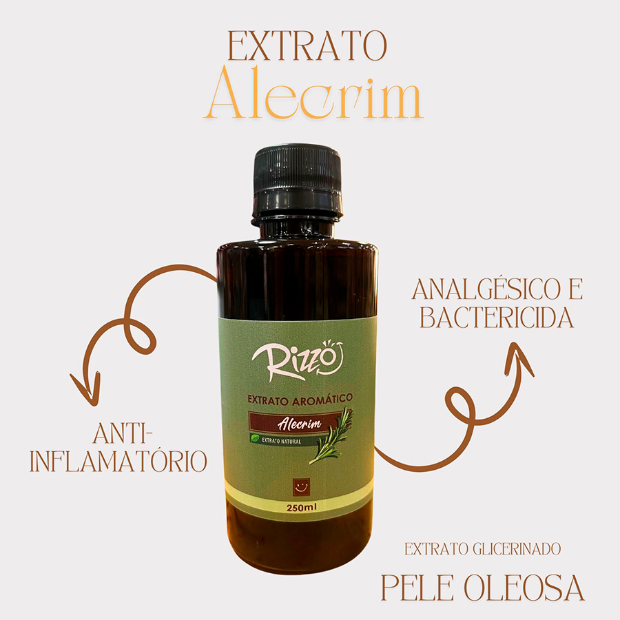 Extrato aromático de alecrim para utilizar em cremes, body splash, bases, sabonete para banho, shampoo e condicionador. Modo de Uso: Aplicar o extrato no produto desejado. (Guardar em local fresco ou seco, ao abrigo da luz. Evite contato com os olhos, boca e mucosas. Em caso de contato com os olhos lave com água abundantemente. Mantenha fora do alcance de crianças. Em caso de irritação suspenda o uso. Uso externo)