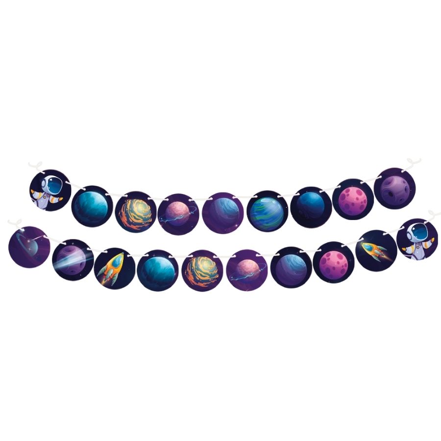 Faixa decorativa com tema espaço, medindo 18,5x16cm. Ideal para dar destaque à decoração de festas infantis com um toque lúdico e criativo inspirado no universo espacial.