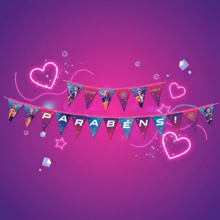 A Faixa Decorativa “Parabéns” – Guerreiras do K-pop – 2,7m é o item perfeito para dar destaque ao ambiente da festa e reforçar o clima vibrante do universo pop coreano. Produzida em material leve e resistente, ela apresenta ilustrações modernas inspiradas nas personagens, criando um visual marcante que combina com mesas principais, painéis fotográficos e áreas de recepção. Acompanha barbante para pendurar, garantindo praticidade e fácil instalação.