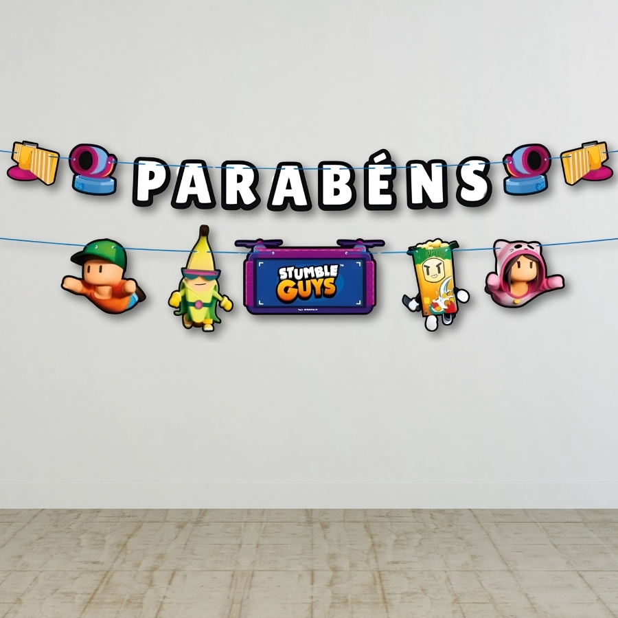 Com cores intensas e personagens icônicos, a faixa Stumble Guys transforma qualquer ambiente em uma verdadeira arena de diversão. É ideal para aniversários infantis e festas temáticas, garantindo um visual criativo, alegre e envolvente, que vai encantar os convidados e os fãs do jogo.