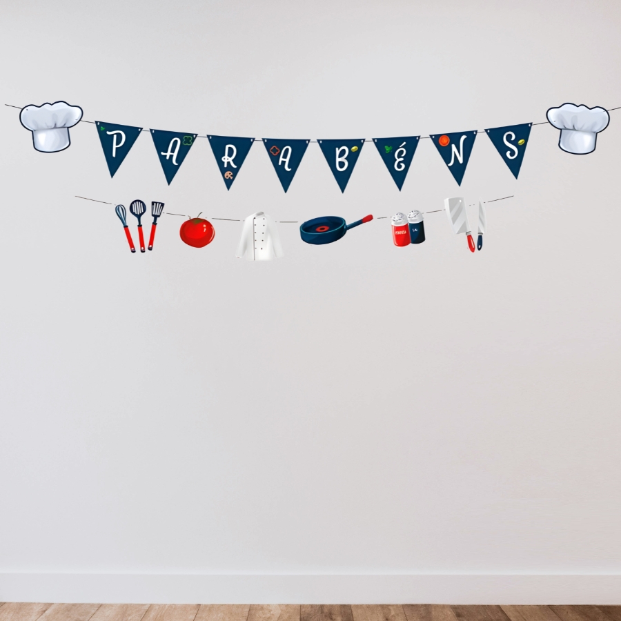 Produzida em material resistente e de alta qualidade, a faixa é fácil de instalar em paredes, painéis ou mesas decorativas. Ela combina com outros itens de decoração culinária, criando uma festa temática completa, organizada e visualmente atraente.