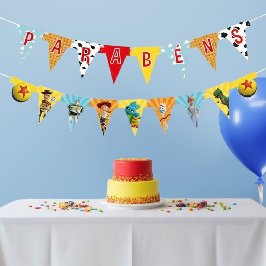 Além da beleza, a Faixa Decorativa inspirada no Toy Story Disney é prática para a ambientação do evento. O produto acompanha cordão de algodão, facilitando a montagem e a aplicação em paredes, mesas ou áreas de destaque. Ideal para complementar a decoração principal, a faixa ajuda a organizar o espaço e reforçar o tema da comemoração de forma criativa.