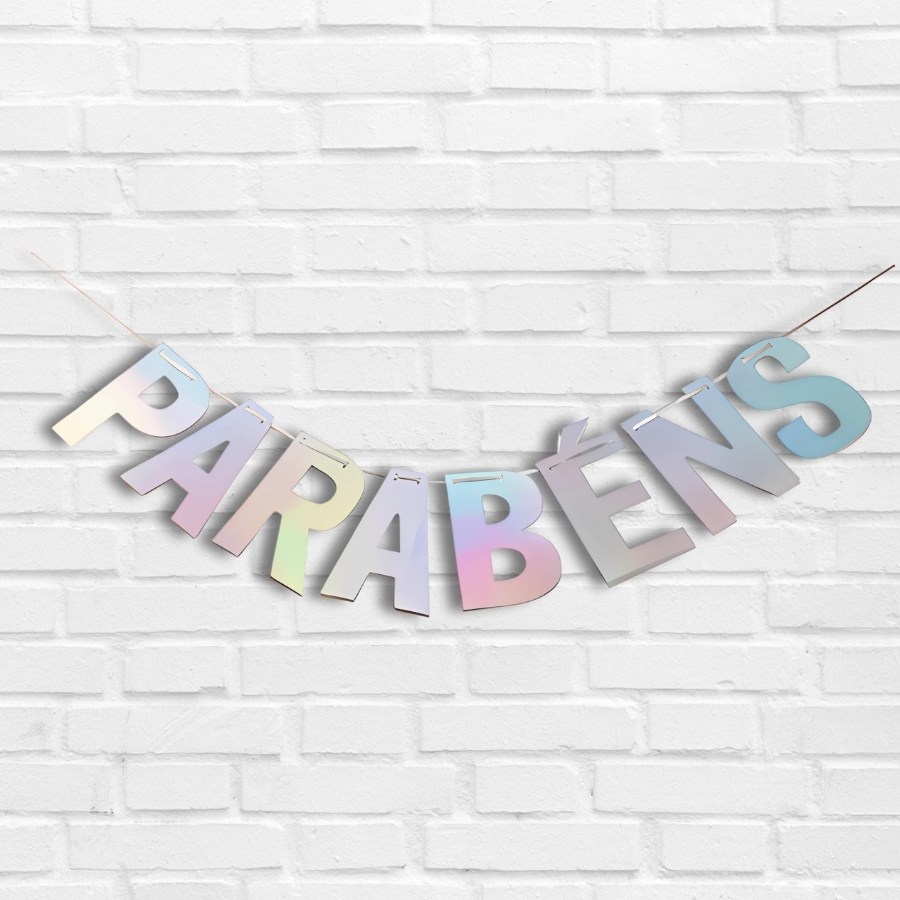 Faixa com a palavra “Parabéns” em acabamento furta-cor, com 2 metros de comprimento. Design moderno, brilho intenso e aplicação simples. Ideal para destacar qualquer ambiente de celebração.