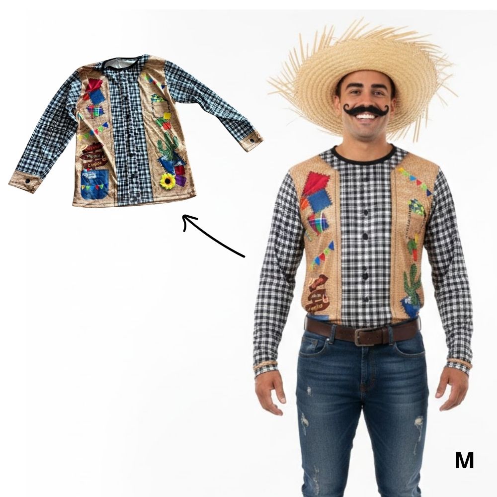 A fantasia de Festa Junina camisa São João é ideal para quem quer celebrar o arraiá com um visual tradicional, alegre e cheio de identidade junina. Com estampa temática inspirada no São João, a camisa traz cores e elementos que remetem às festas típicas, sendo perfeita para quadrilhas, eventos temáticos, festas caipiras e comemorações juninas em geral.