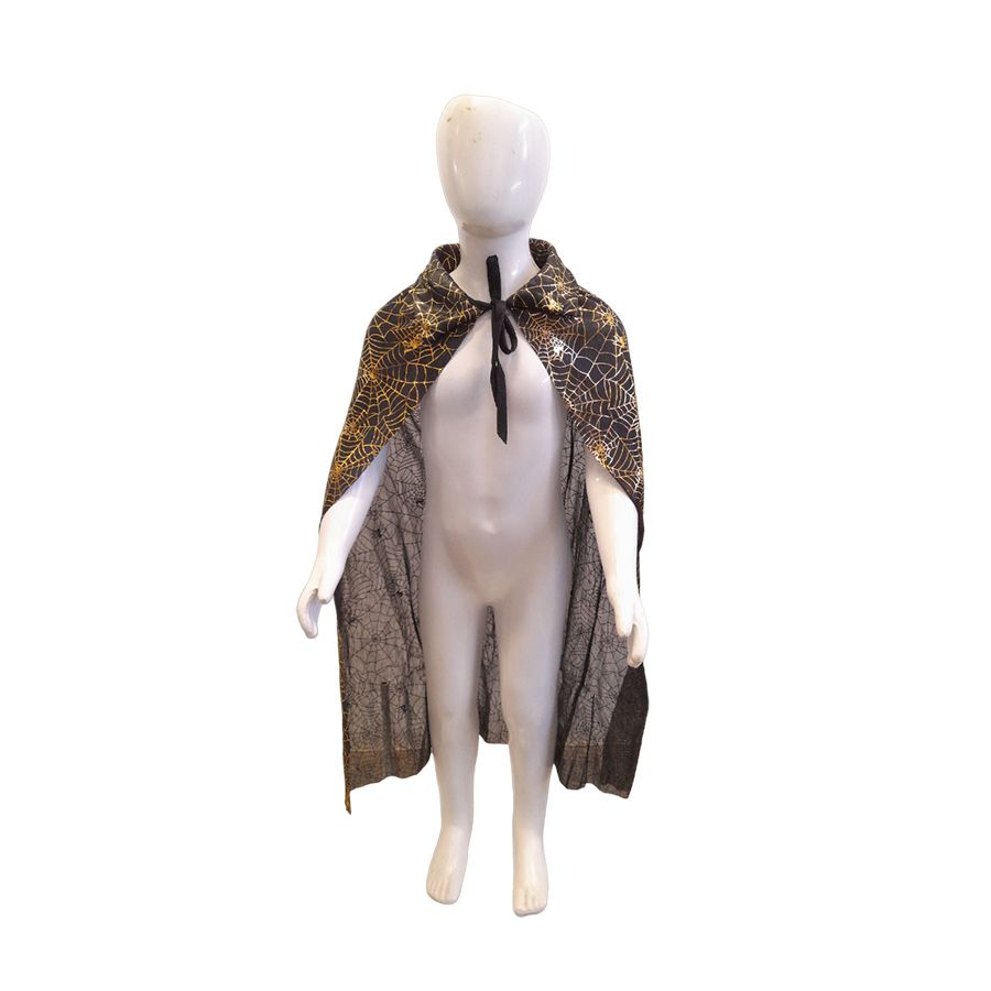 Capa de poliéster com estampa de teia de aranha e com cordões para amarrar. Tamanho infantil.