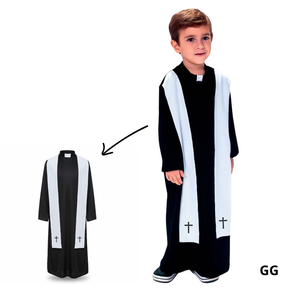A fantasia infantil de padre é uma escolha tradicional e cheia de charme para compor personagens clássicos da Festa Junina. Com visual temático inspirado no traje típico, é perfeita para apresentações de quadrilha, festas escolares, eventos culturais e comemorações de São João, trazendo um toque divertido e característico ao figurino.