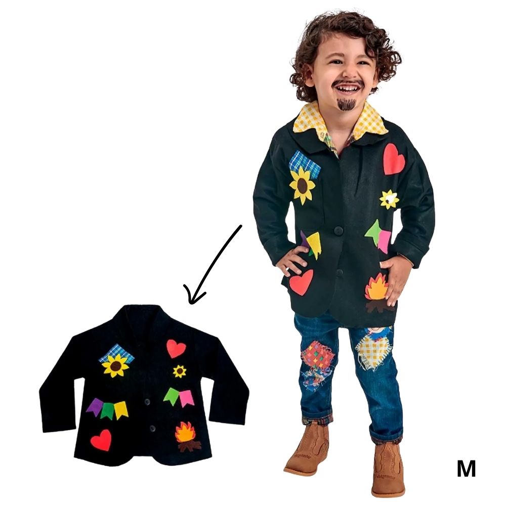 Combine o paletó junino infantil com camisa, calça, chapéu de palha e acessórios caipiras para montar um visual completo, perfeito para apresentações, ensaios e fotos temáticas.