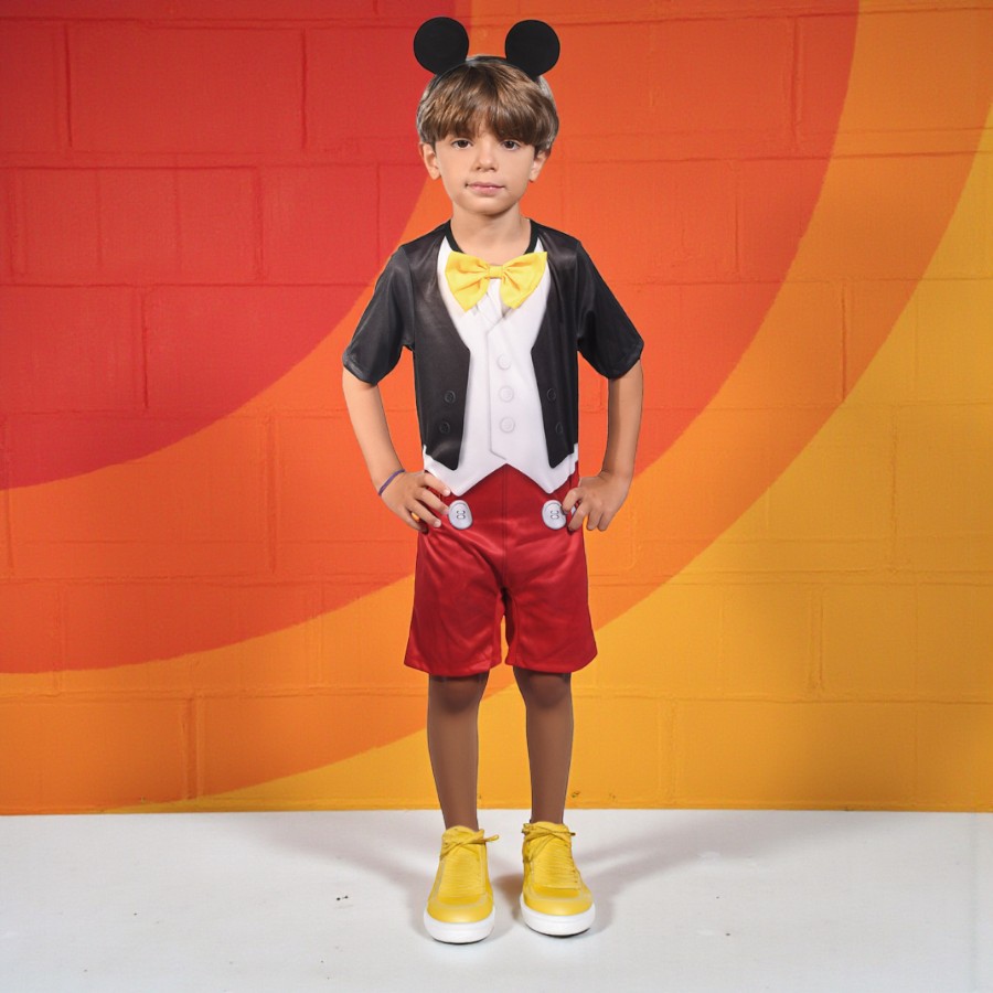 Fantasia infantil com macacão e tiara de orelha, inspirados em Mickey Mouse Disney.