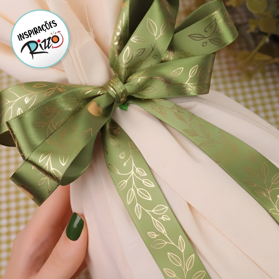 A Fita de Cetim Hostamp Dourado ECF003H possui largura de 15mm, cor 523 e estampa Ramos Dourados Fundo Verde. É comercializada em rolo de 10 metros e indicada para laços, acabamentos decorativos, embalagens, lembrancinhas e aplicações artesanais.