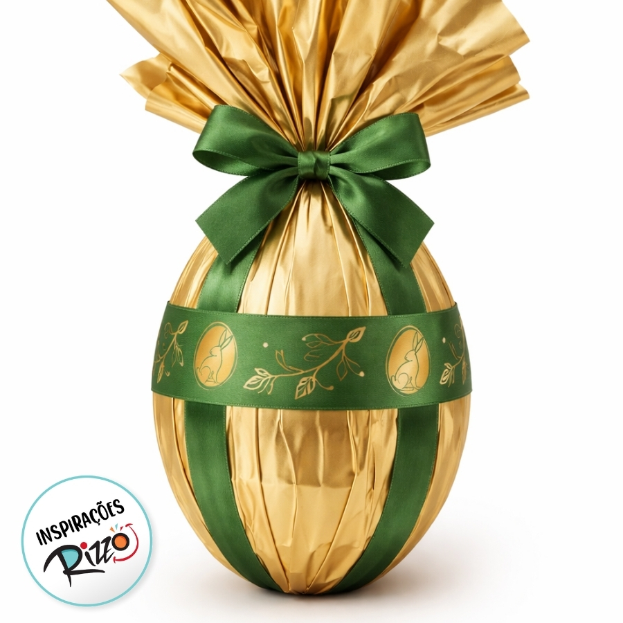A Fita de Cetim Hostamp Dourado ECF005H possui largura de 22mm, cor 1110 e estampa Folhagem de Páscoa Ouro. Comercializada em rolo de 10 metros, é indicada para laços, acabamentos decorativos, embalagens, lembrancinhas e aplicações artesanais com temática de Páscoa.