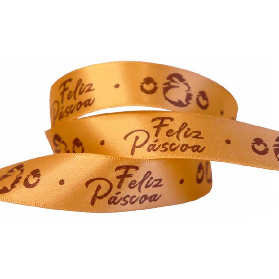 Fita de Páscoa em Cetim 22mmx10m Coelho Feliz Páscoa Ouro com Marrom ECF005D 257 Progresso Rizzo Embalagens