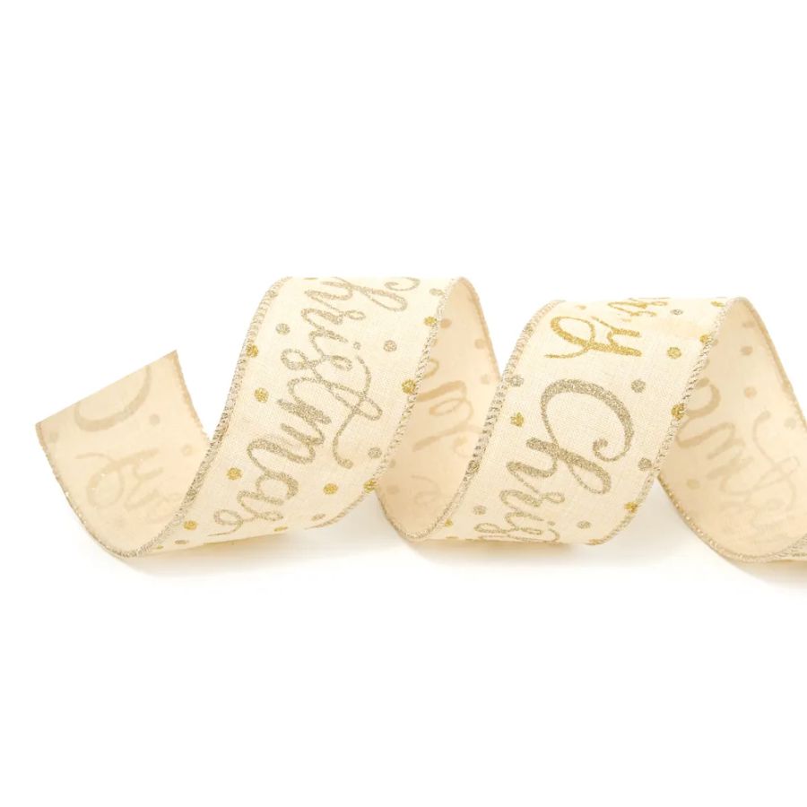 Fita decorativa aramada Merry Christmas algodão cru e ouro, medindo 6,3 cm de largura por 914 cm de comprimento.