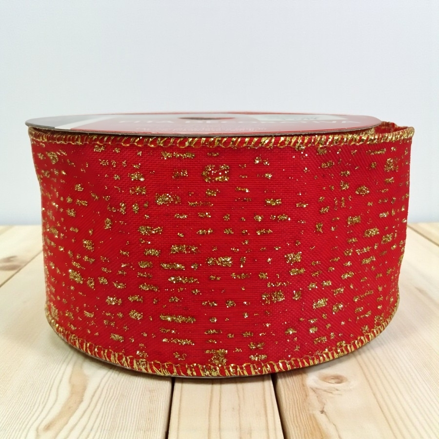 Fita decorativa vermelha com acabamento em glitter dourado, medindo 6,3cm de largura por 914cm de comprimento. Ideal para laços, guirlandas, arranjos, embalagens e decorações de Natal.