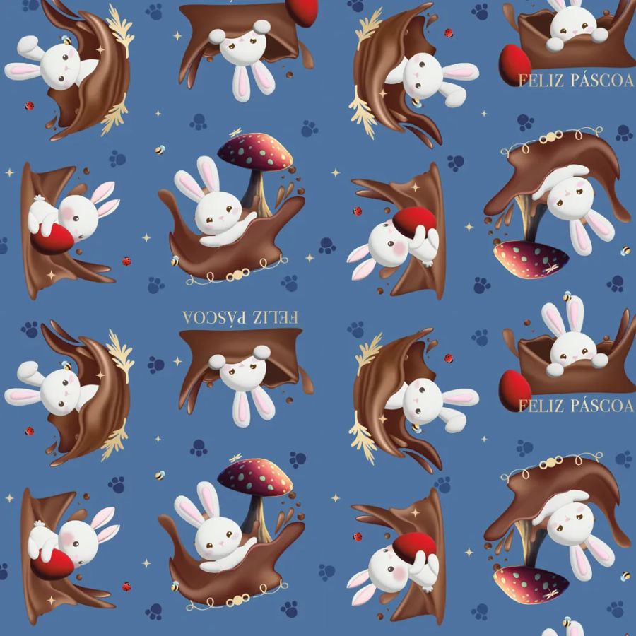 Folha decorativa "Contos de Páscoa" azul, tamanho 69x89 cm, perfeita para embalar ovos de Páscoa com charme e delicadeza.