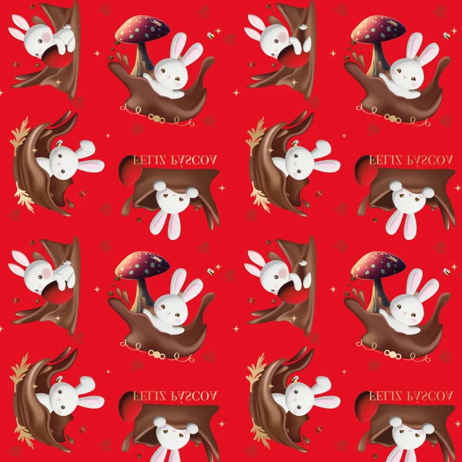 Folha decorativa vermelha "Contos de Páscoa", tamanho 69x89 cm, perfeita para embalar ovos de Páscoa com estilo e delicadeza.