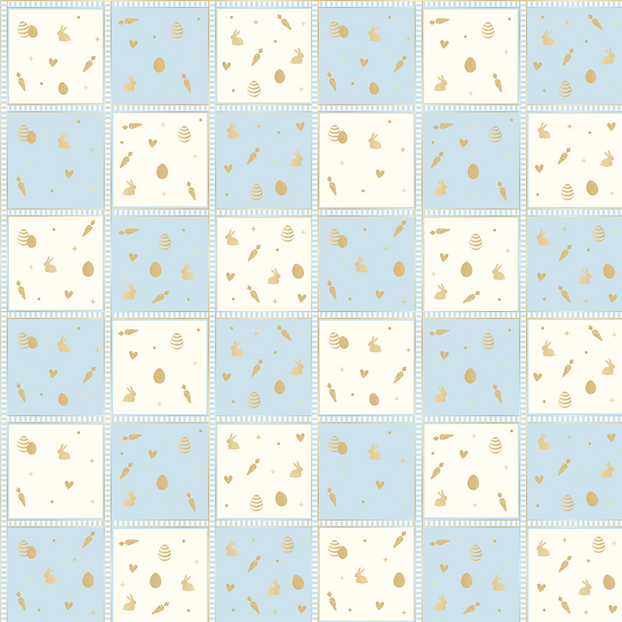 Folha para ovos de Páscoa, com quadrados brancos e azuis e detalhes em dourados, com desenhos de coração, cenouras e coelhos.