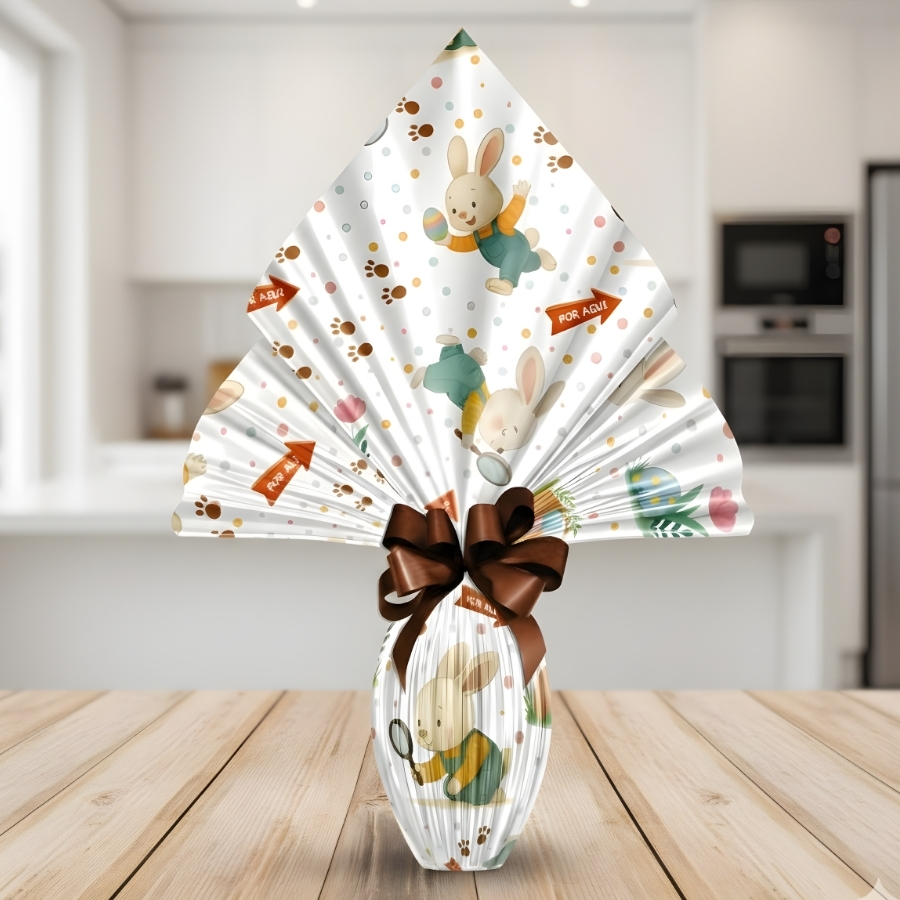 A Folha Poli Páscoa Perolada - 70x90cm - Caça aos Ovos é utilizada para embalar ovos de chocolate, cestas e kits de Páscoa. Produzida em material poli perolado estampado, combina resistência, flexibilidade e acabamento sofisticado, sendo indicada para uso profissional e comercial.