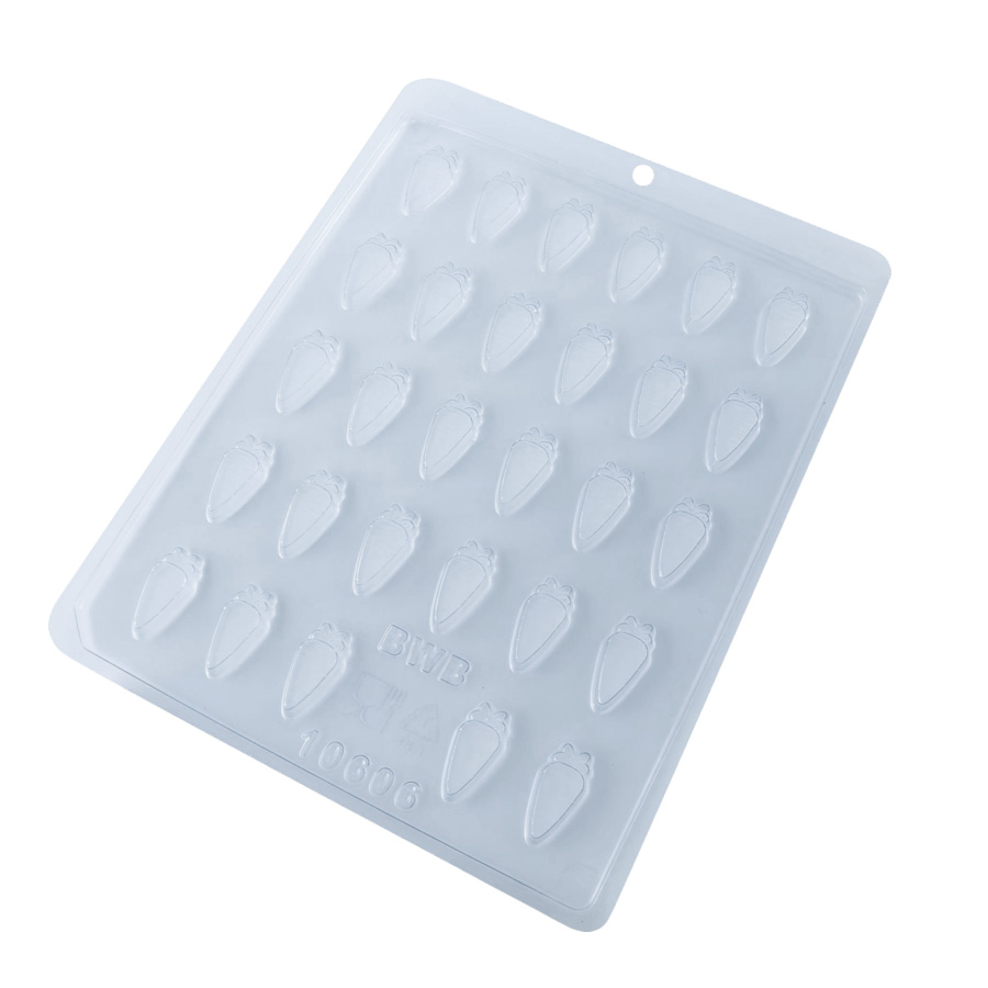 A Forma de Acetato Aplique Cenourinhas é ideal para criar pequenos apliques de chocolate que vão transformar suas decorações de Páscoa! Com essa forma, você pode facilmente produzir cenourinhas de chocolate para decorar ovos de Páscoa e outros doces temáticos. Seus detalhes minuciosos proporcionam um acabamento perfeito, dando um toque especial às suas criações.