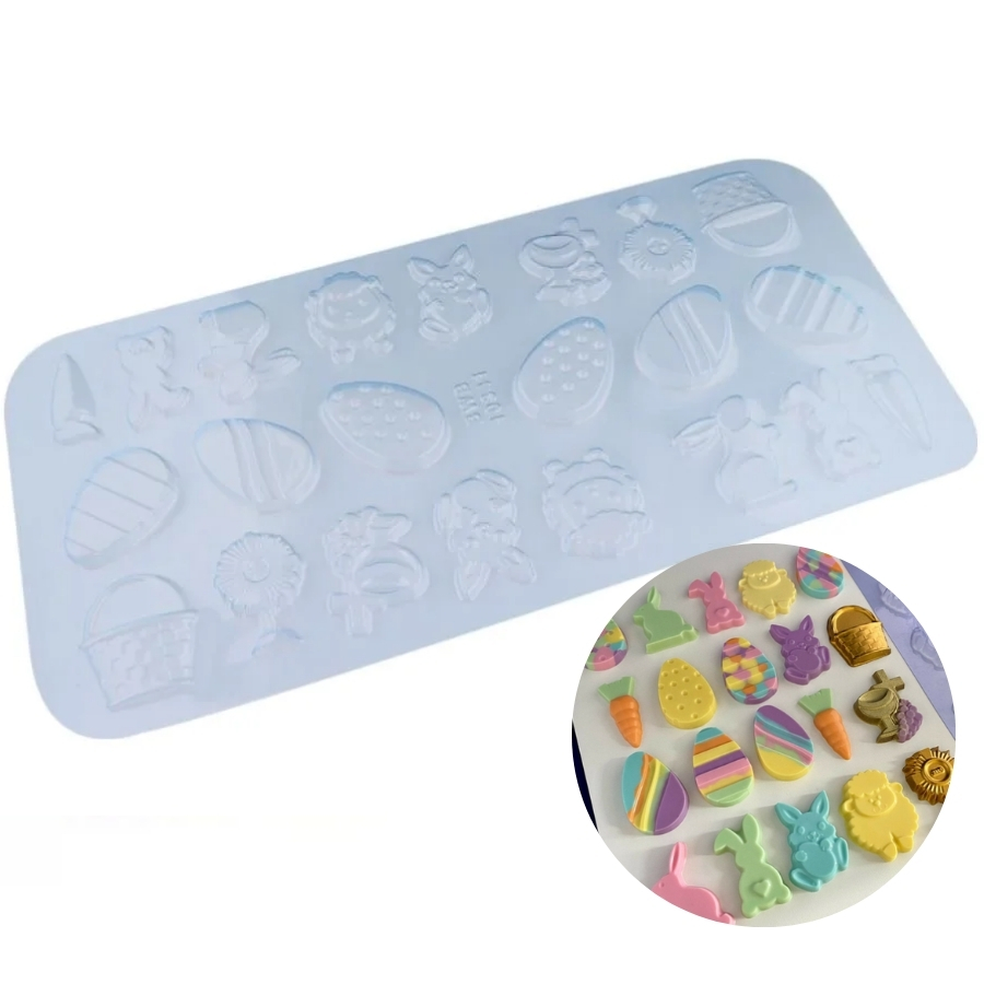Forma simples tradicional para Páscoa, feita em acetato de alta qualidade, com moldes de coelho, ovelha, ovos e símbolos religiosos. Ideal para criar chocolates temáticos, decorados e cheios de significado para a data.